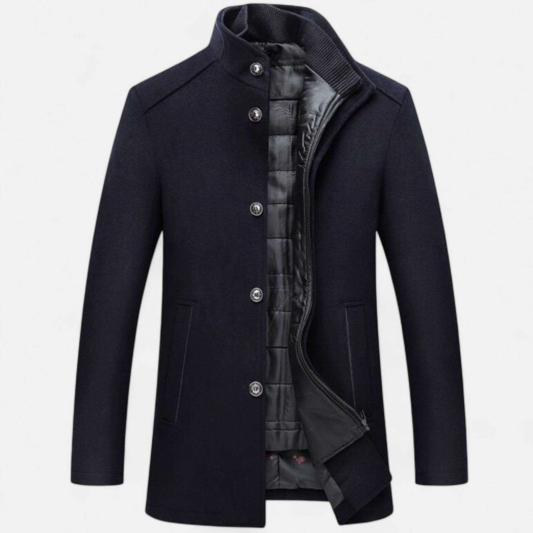 Achieve refined layering. Featuring a built-in vest panel beneath the stand collar, this coat offers structure and versatility, adapting seamlessly from a boardroom to a countryside drive.